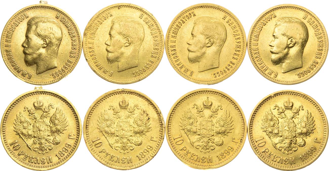 Золото. 10 рублей 1899 года. АГ-(АГ). 8,6 г. Уздеников 0332. Биткин 4. Царский чекан. Запил кромки гурта аверса на 6 часов. 10 рублей 1899 года. АГ-(АГ). 8,58 г. Уздеников 0332. Биткин 4. Царский чекан. Ударчик по кромке гурта реверса на 5 часов, следы удаления подвески на 12 часов. 10 рублей 1899 года. АГ-(АГ). 8,57 г. Уздеников 0332. Биткин 4. Царский чекан. Запил кромки гурта аверса на 11 часов. 10 рублей 1899 года. АГ-(АГ). 8,57 г. Уздеников 0332. Биткин 4. Царский чекан. Запил на гурте на 5 часов, следы многочисленных ударов по кромке гурта аверса и реверса.