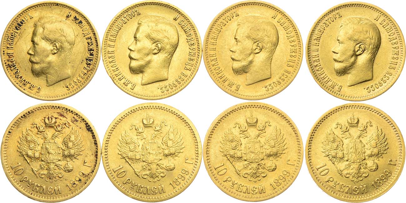 Золото 900 пробы. 10 рублей 1899 года. АГ-(Э•Б). 8,56 г. Уздеников 0333. Биткин 5. Казаков 155. Царапинки на полях. XF/AU-. 10 рублей 1899 года. АГ-(ЭБ). 8,58 г. Уздеников 0333. Биткин 5. Казаков 156. Царапинки на полях, ударчики по кромке гурта. XF. 10 рублей 1899 года. АГ-(ЭБ). 8,59 г. Уздеников 0333. Биткин 5. Казаков 156. Царапинки на полях. XF/AU. 10 рублей 1899 года. АГ-(ЭБ). 8,56 г. Уздеников 0333. Биткин 5. Казаков 156. Царапинки на полях, загрязнение, следы механической чистки. VF/XF.