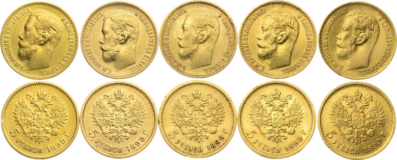 Золото 900 пробы. 5 рублей 1899 года. АГ-(ЭБ). 4,28 г. Уздеников 0335. Биткин 23. Казаков 159. Царапинки на полях. XF. 5 рублей 1899 года. АГ-(ЭБ). 4,28 г. Уздеников 0335. Биткин 23. Казаков 159. Царапинки на полях, запил кромки гурта аверса на 2 часа. AU. 5 рублей 1899 года. АГ-(ФЗ). 4,3 г. Уздеников 0336. Биткин 24. Казаков 158. Царапинки на полях, ударчики по кромке гурта. XF. 5 рублей 1899 года. АГ-(ЭБ). 4,26 г. Уздеников 0335. Биткин 23. Казаков 159. Царапинки на полях, ударчики по гурту. XF. 5 рублей 1899 года. АГ-(ФЗ). 4,24 г. Уздеников 0336. Биткин 24. Казаков 158. Царапинки на полях, ударчики и запилы на кромке гурта, начальная патина. XF.