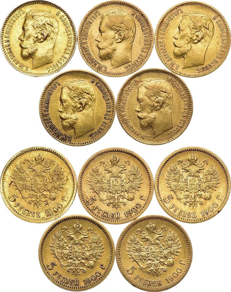 Золото 900 пробы. 5 рублей 1900 года. АГ-(ФЗ). 4,27 г. Уздеников 0339. Биткин 26. Казаков 203. Ударчики по кромке гурта, пятна. XF. 5 рублей 1900 года. АГ-(ФЗ). 4,26 г. Уздеников 0339. Биткин 26. Казаков 203. Запил на кромке гурта аверса на 5 часов. XF. 5 рублей 1900 года. АГ-(ФЗ). 4,26 г. Уздеников 0339. Биткин 26. Казаков 203. Запил на кромке гурта аверса на 1 час. XF. 5 рублей 1900 года. АГ-(ФЗ). 4,29 г. Уздеников 0339. Биткин 26. Казаков 203. Запил на кромке гурта аверса на 3 часа, царапинки, забоины. XF-. 5 рублей 1900 года. АГ-(ФЗ). 4,3 г. Уздеников 0339. Биткин 26. Казаков 203. Царапинки на полях. XF.