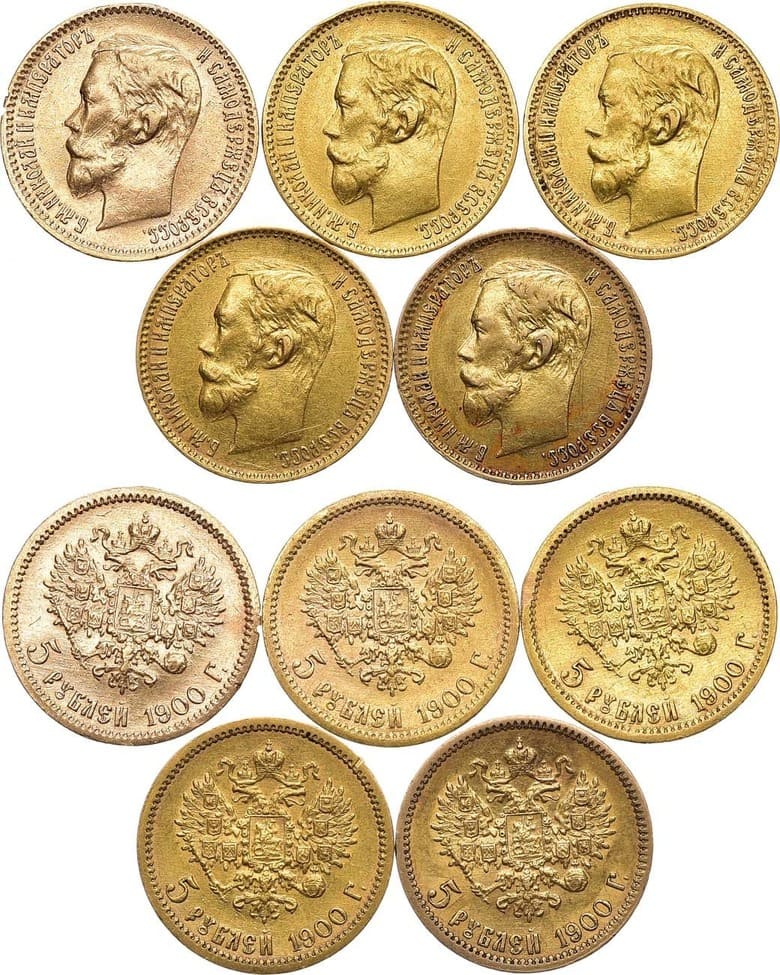 Золото 900 пробы. 5 рублей 1900 года. АГ-(ФЗ). 4,25 г. Уздеников 0339. Биткин 26. Казаков 203. Двойной запил на гурте на 3 часа, следы удалённого ушка на 12 часов. XF. 5 рублей 1900 года. АГ-(ФЗ). 4,28 г. Уздеников 0339. Биткин 26. Казаков 203. Царапинки на полях. XF/AU. 5 рублей 1900 года. АГ-(ФЗ). 4,3 г. Уздеников 0339. Биткин 26. Казаков 203. Запил на кромке гурта аверса на 1 час, царапинки на полях. XF. 5 рублей 1900 года. АГ-(ФЗ). 4,28 г. Уздеников 0339. Биткин 26. Казаков 203. Царапинки на поле реверса на 11 часов, начальная патина. XF. 5 рублей 1900 года. АГ-(ФЗ). 4,29 г. Уздеников 0339. Биткин 26. Казаков 203. Запилы на кромке гурта аверса на 10 и 12 часов, царапинки на полях. XF.