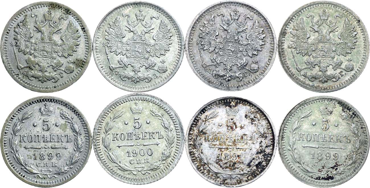 Серебро. 5 копеек 1891 года. СПБ-АГ. 0,89 г. Уздеников 2047. Биткин 151. Фрагментарная многоцветная патина на реверсе. AU. 5 копеек 1899 года. СПБ-АГ. 0,91 г. Уздеников 2110. Биткин 173. Казаков 186. "99" сближены. AU. 5 копеек 1899 года. СПБ-АГ. 0,85 г. Уздеников 2110. Биткин 173. Казаков 187. "99" удалены. XF/AU. 5 копеек 1900 года. СПБ-ФЗ. 0,85 г. Уздеников 2117. Биткин 175. Казаков 212. AU/UNC.