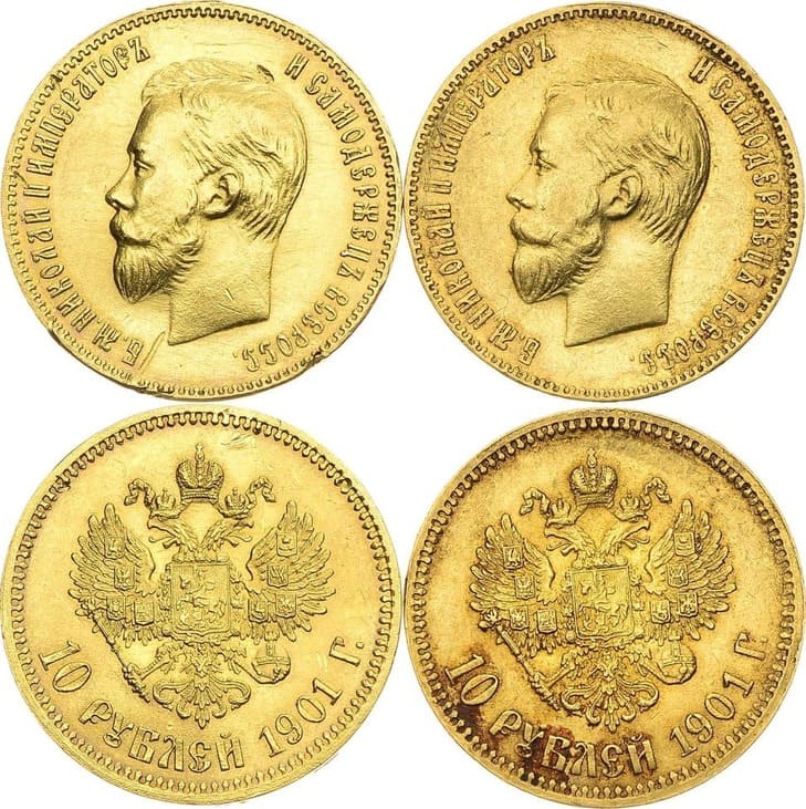 Золото. 10 рублей 1901 года. АГ-(А•Р). 8,6 г. Биткин 9. Казаков 221. Царапинки на полях, дефект кромки гурта реверса на 5, 7, 8, 12 часов. XF. 10 рублей 1901 года. АГ-(Ф•З). 8,58 г. Биткин 8. Казаков 220. Царапинки на полях, загрязнение. XF/AU.