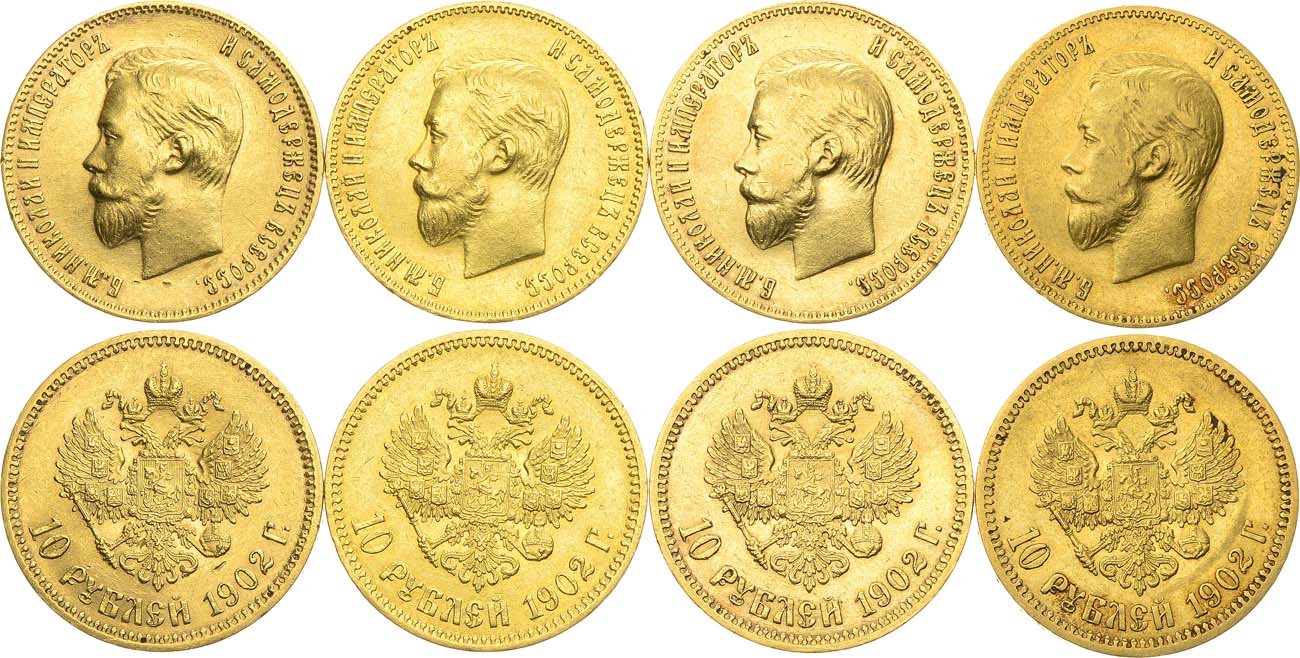 Золото 900 пробы. 10 рублей 1902 года. АГ-(А•Р). 8,58 г. Уздеников 0344. Биткин 10. Казаков 251. Царапинки на полях, ударчики по кромке гурта, загрязнение. AU. 10 рублей 1902 года. АГ-(А•Р). 8,56 г. Уздеников 0344. Биткин 10. Казаков 251. Царапинки на полях, запил кромки гурта аверса на 5 часов, загрязнение. AU. кромке гурта, загрязнение. AU. 10 рублей 1902 года. АГ-(А•Р). 8,59 г. Уздеников 0344. Биткин 10. Казаков 251. Царапинки на полях, загрязнение. AU. 10 рублей 1902 года. АГ-(А•Р). 8,61 г. Уздеников 0344. Биткин 10. Казаков 251. Царапина на поле реверса слева от портрета, удар по кромке гурта реверса на 12 часов, загрязнение. AU.