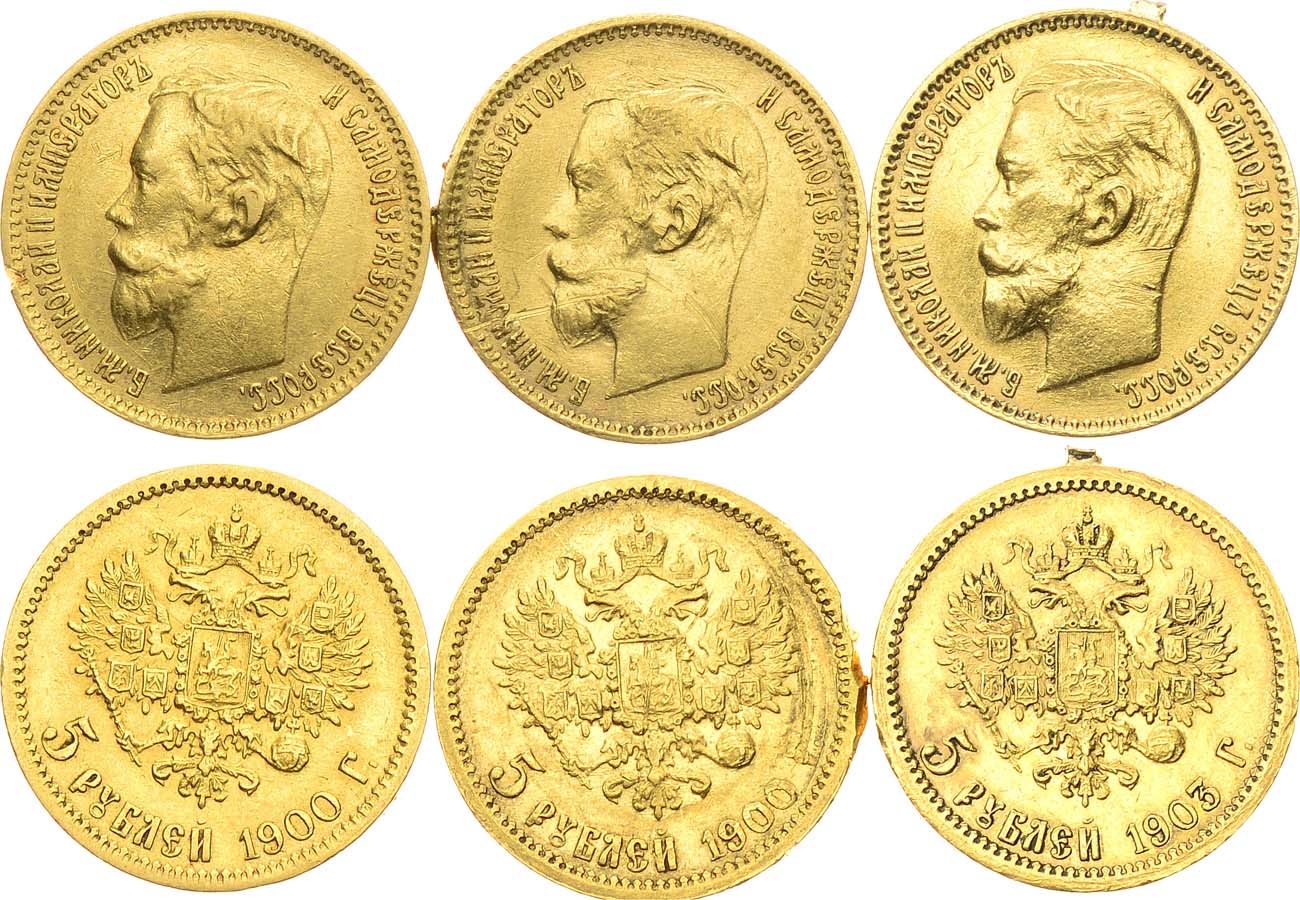 Золото. 5 рублей 1900 года. АГ-(ФЗ). 4,27 г. Уздеников 0339. Биткин 26. Изгиб кружка. Дефект гурта на 3 часа, царапинки. VF. 5 рублей 1900 года. АГ-(ФЗ). 4,26 г. Уздеников 0339. Биткин 26. Запил на кромке гурта аверса на 8 часов. XF. 5 рублей 1903 года. АГ-(АР). 4,28 г. Уздеников 0347. Биткин 30. След спила ушка для ношения на 12 часов, запилы на бюсте. XF.