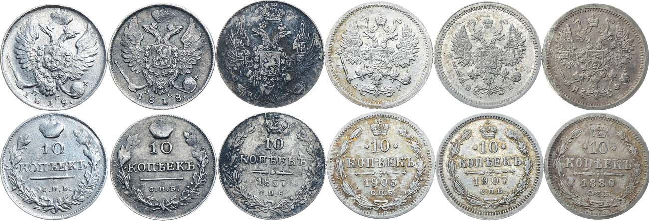 Серебро. 10 копеек 1818 года. СПБ-ПС. Биткин 232. XF. 10 копеек 1819 года. СПБ-ПС. Биткин 233. XF. 10 копеек 1837 года. СПБ-НГ. Биткин 353. XF. 10 копеек 1880 года. СПБ-НФ. Биткин 266. VF. 10 копеек 1903 года. СПБ-АР. Биткин 155. XF. 10 копеек 1907 года. СПБ-ЭБ. Биткин 159. AU.