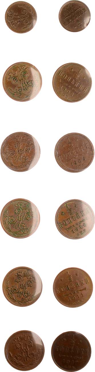 Медь. 1/4 копейки 1900 года. СПБ. Завод Розенкранца в СПБ. Медь. 0,76 г. Уздеников 3893. Биткин 311. Казаков 217. Брекке 274. 7. AU/UNC. 1/2 копейки 1908 года. СПБ. Медь. 1.59 г. Уздеников 3918. Биткин 268. Казаков 350. Брекке 274. 19. Следы чистки. XF. 1/2 копейки 1909 года. СПБ. Медь. 1.75 г. Уздеников 3922. Биткин 269. Казаков 371. Брекке 274. 20. AU. 1/2 копейки 1910 года. СПБ. Медь. 1.62 г. Уздеников 3927. Биткин 270. Казаков 387. Брекке 274. 21. XF. 1/2 копейки 1911 года. СПБ. Медь. 1.62 г. Уздеников 3933. Биткин 271. Казаков 405. Брекке 274.22. XF/AU. 1/2 копейки 1912 года. СПБ. Медь. 1.66 г. Уздеников 3938. Биткин 272. Казаков 428. Брекке 274. 23. AU.