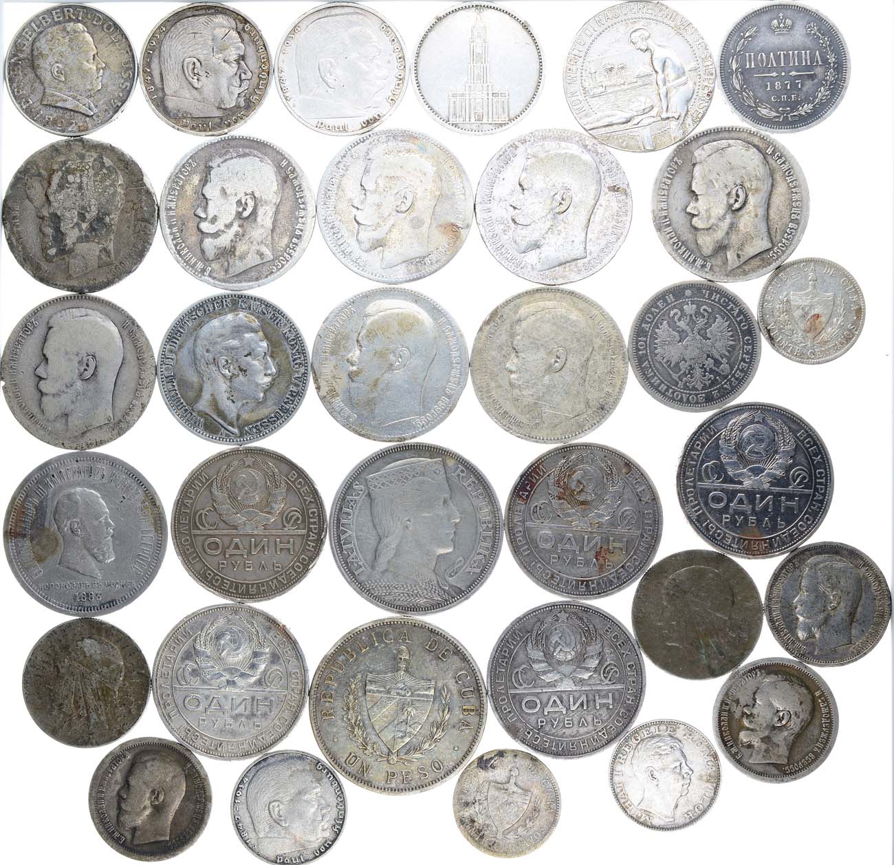 Серебро. Россия. Рубли: 1883 (ЛШ), 1896 (АГ) 2 экз., 1896 (*), 1897 (АГ), 1898 (АГ), 1898 (**), 1898 г., 1899 (**), 1924-5 экз. Полтины: 1877 (СПБ-НI) 2 шт., 1896 (АГ), 1899 (*), 1913 (ВС). Латвия: 5 лат 1929 года. Польша: 5 злотых 1932 года (Ядвига), 5 злотых 1933 года (Ядвига). Австрия: 2 шиллинга 1934 года. Румыния: 200 леев 1942 года. Куба: 1 песо 1932 года, 20 сентаво 1915 года, 20 сентаво 1949 года. Германия: 5 рейхсмарок 1935 года (Кирха), 5 рейхсмарок 1936 года (Гинденбург), 5 рейхсмарок 1939 года (Гинденбург), 2 рейхсмарки 1938 года (Гинденбург). Пруссия: 3 марки 1909 года (А). Вильгельм II. Египет: медаль. F-XF.
