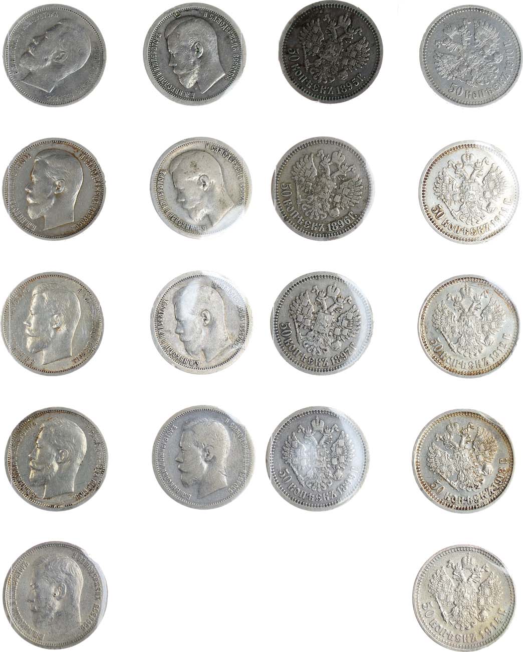 Серебро. 50 копеек 1895 года. (АГ). Серебро. 9,86 г. Уздеников 2064. Биткин 71. Казаков 11. Дефект на поле реверса на 12 часов. VF. 50 копеек 1896 года. (А*Г). Серебро. 9,67 г. Уздеников 2073. Биткин 196. Казаков 39. VF. 50 копеек 1897 года. (А*Г). Серебро. 9,82 г. Уздеников 2082. Биткин 197. Казаков 85. VF/XF. 50 копеек 1899 года. (АГ). Серебро. 9,79 г. Уздеников 2100. Биткин 75. Казаков 170. VF. 50 копеек 1910 года. (ЭБ). Серебро. 9,94 г. Уздеников 2178. Биткин 89(R). Казаков 380. VF/XF. 50 копеек 1911 года. (ЭБ). Серебро. 9,94 г. Уздеников 2183. Биткин 90. Казаков 396. XF. 50 копеек 1912 года. (ЭБ). Серебро. 9,97 г. Уздеников 2189. Биткин 91. Казаков 417. XF. 50 копеек 1913 года. (ВС). Серебро. 9,97 г. Уздеников 2199. Биткин 92. Казаков 440. XF/AU. 50 копеек 1914 года. (ВС). Серебро. 9,97 г. Уздеников 2209. Биткин 93. Казаков 462. XF/AU.