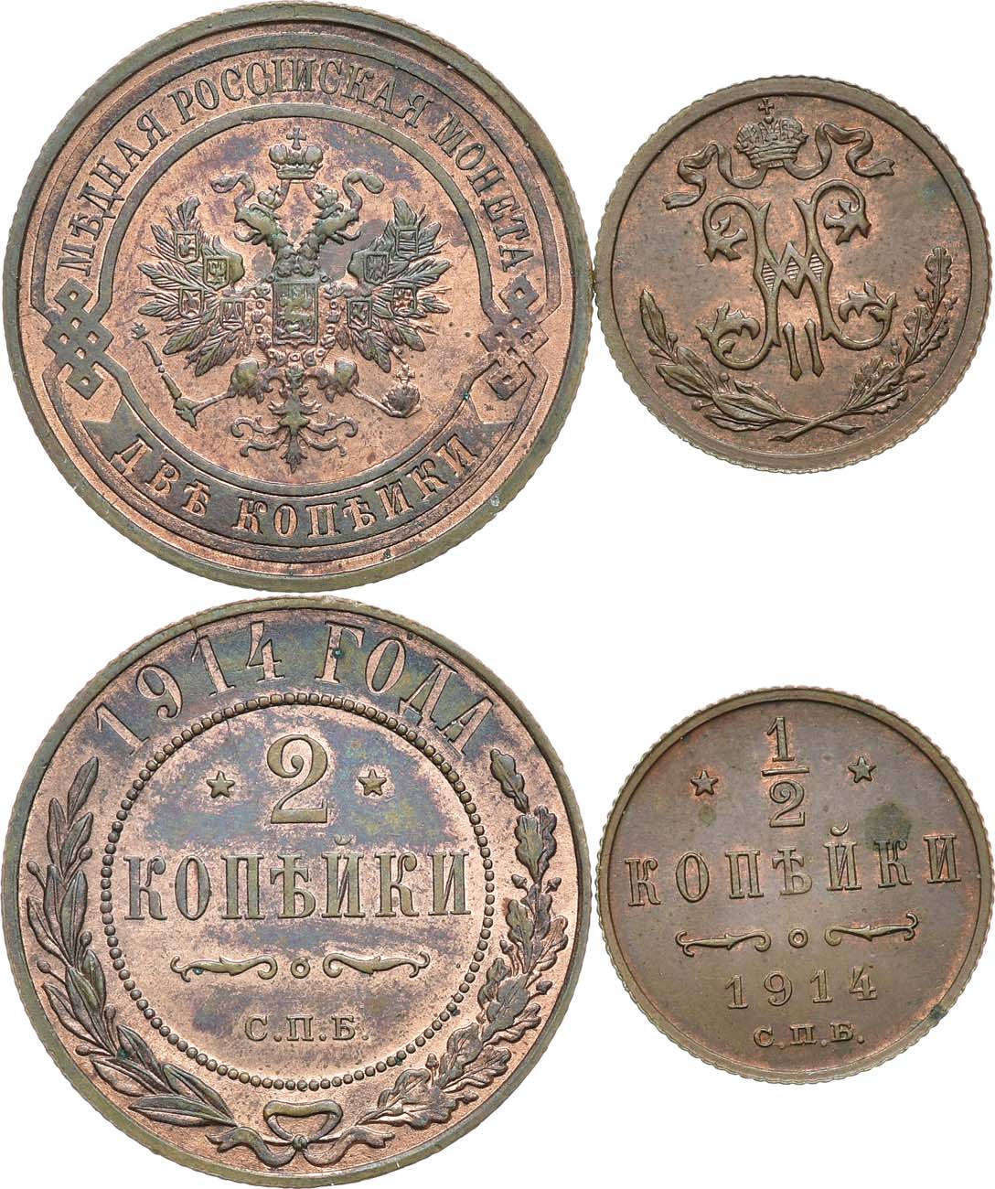 Медь. 1/2 копейки 1914 года. СПБ. 1,6 г. Уздеников 3946. Биткин 274. Казаков 487. Брекке 274.25. UNC. 2 копейки 1914 года. СПБ. 6.69 г. Уздеников 3944. Биткин 244. Казаков 485. Брекке 275.69. UNC-.