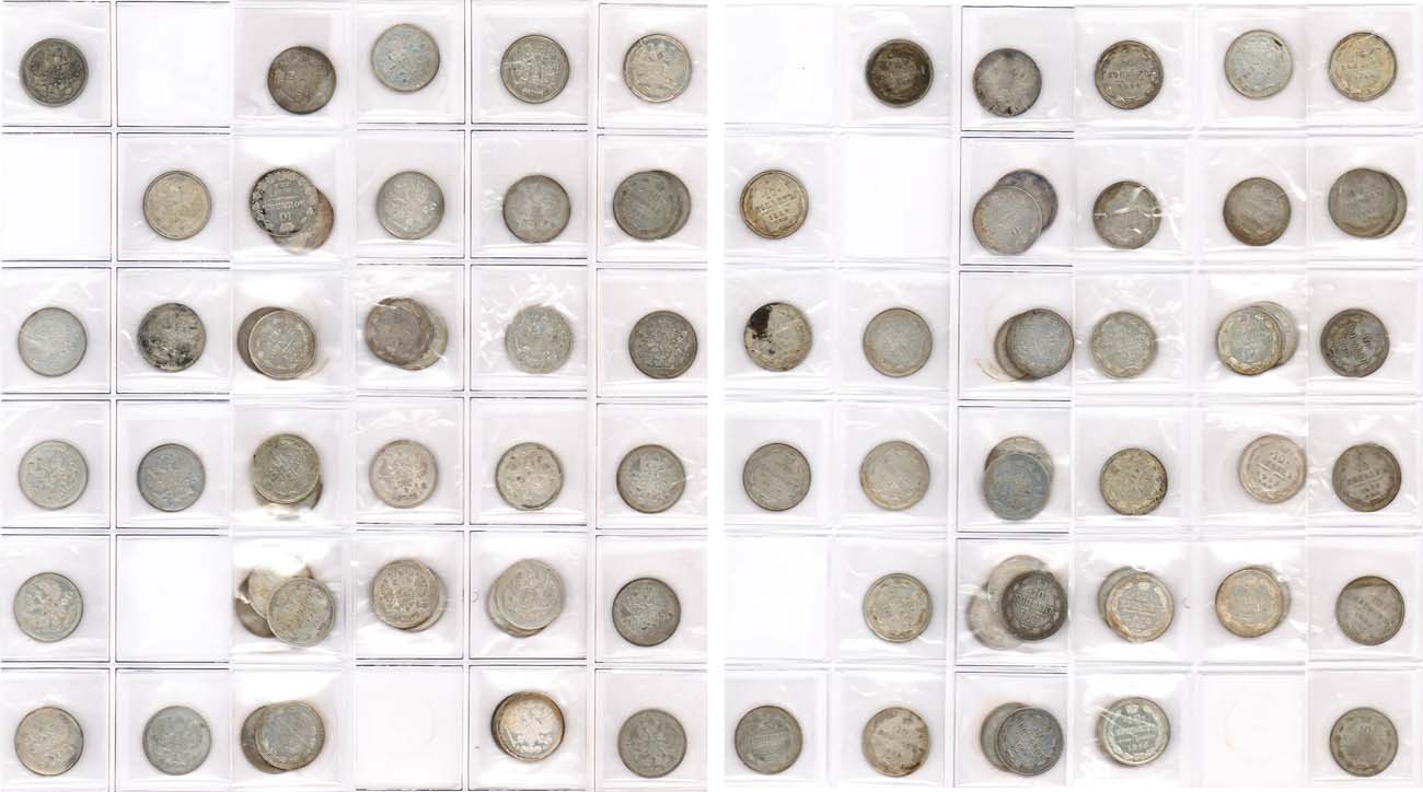 Серебро. 10 копеек 1828 года, 1835, 1837, 1855,1859, 1861 (2 шт.), 1862, 1863, 1865, 1867, 1868, 1886, 1889, 1890, 1893, 1894, 1896, 1897, 1898, 1899, 1900, 1901 (2 шт.), 1902, 1903, 1904, 1905, 1906, 1907, 1908, 1909, 1910, 1911 (2 шт.), 1912, 1913, 1914 (2 шт.), 1915 (2 шт.), 1916 (2 шт.) гг VF/UNC.