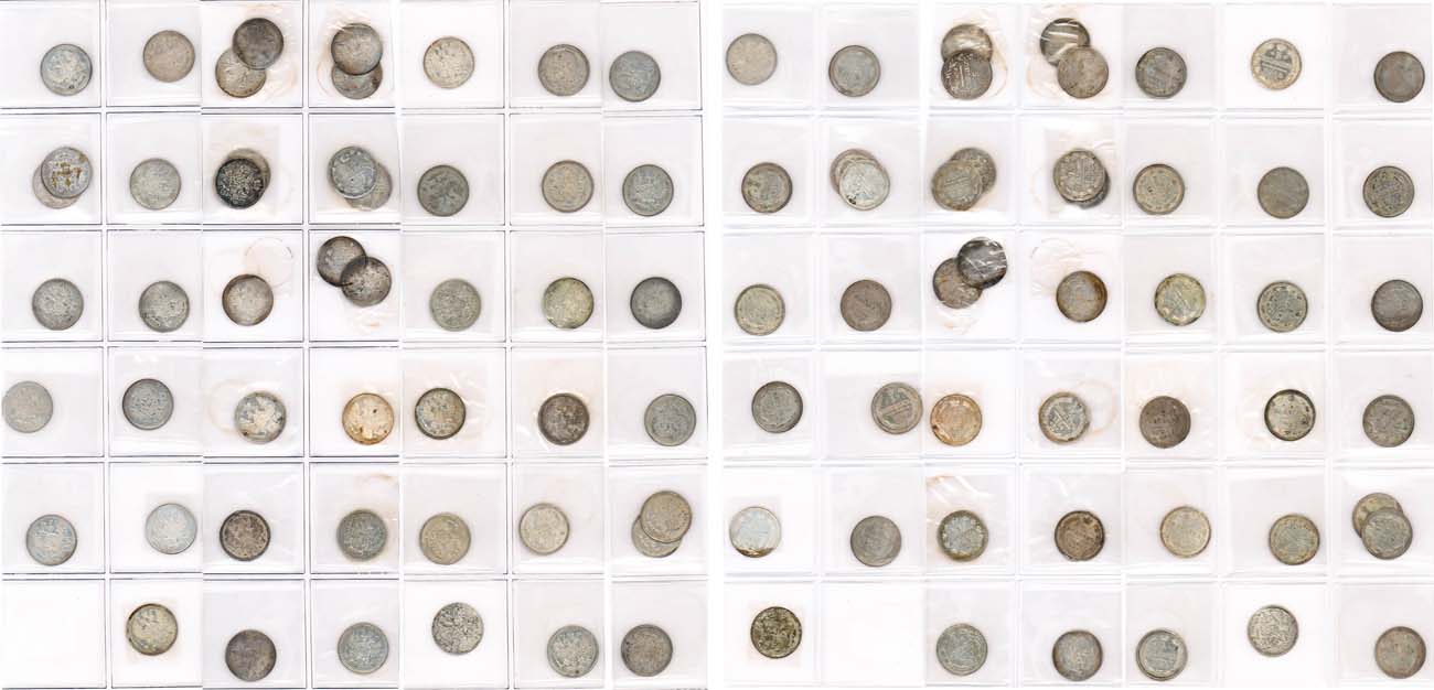 Серебро. 5 копеек 1826 года (2 шт.), 1827, 1830, 1831, 1835, 1836, 1837, 1838, 1845, 1849, 1850, 1853, 1854, 1856, 1861, 1874, 1882, 1883, 1884, 1885, 1886, 1887, 1888, 1889, 1890, 1891, 1892, 1893, 1897, 1898, 1899, 1900, 1901 (2 шт.), 1902, 1903, 1905, 1906, 1909 (2 шт.), 1910, 1911, 1912, 1913 (2 шт.), 1914, 1915 гг F/UNC.