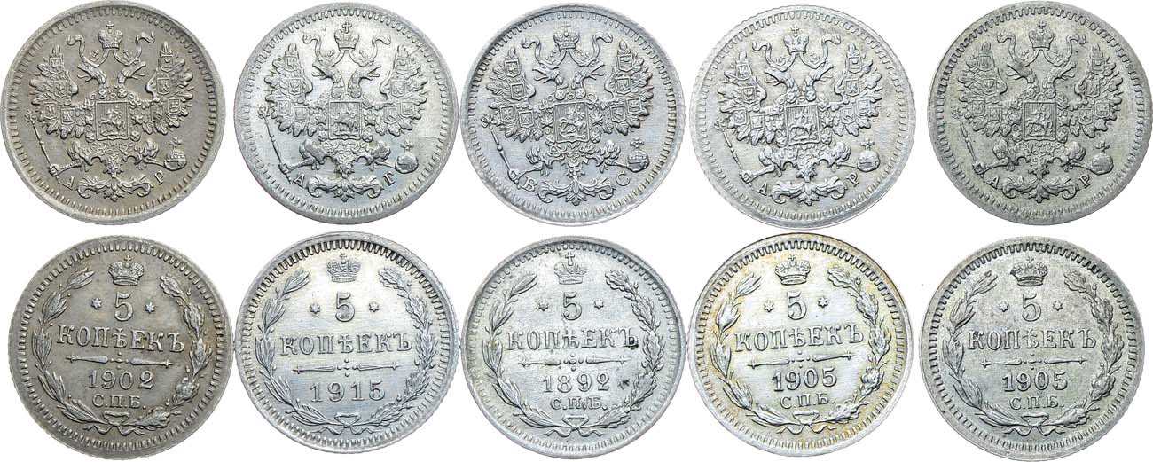 Серебро. 5 копеек 1892 года. СПБ-АГ. 0,9 г. Уздеников 2051. Биткин 152. AU-. 5 копеек 1902 года. СПБ-АГ. 0,88 г. Уздеников 2136. Биткин 179. Казаков 259. AU/UNC. 5 копеек 1905 года. СПБ-АР. 0,93 г. Уздеников 2153. Биткин 182. Казаков 299. AU/UNC. 5 копеек 1905 года. СПБ-АР. 0,85 г. Уздеников 2153. Биткин 182. Казаков 299. UNC-. 5 копеек 1915 года. ВС. 0,89 г. Уздеников 2218. Биткин 192. Казаков 483. UNC.