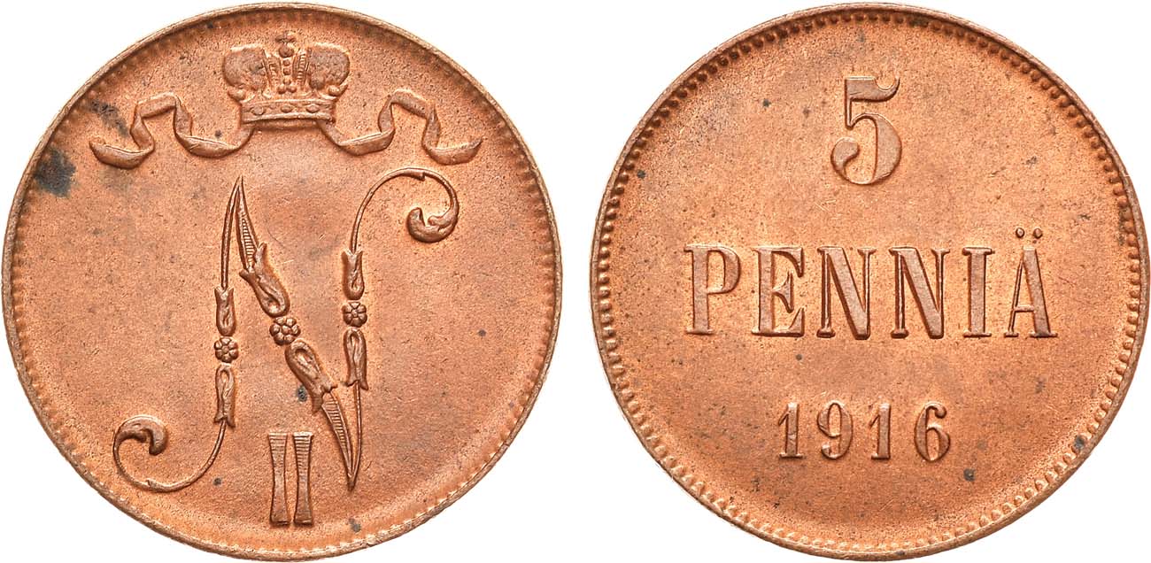 Медь. 6,48г. Для Финляндии. Гельсингфорсский монетный двор. Уздеников 4833. Биткин 456. Казаков 522. UNC.