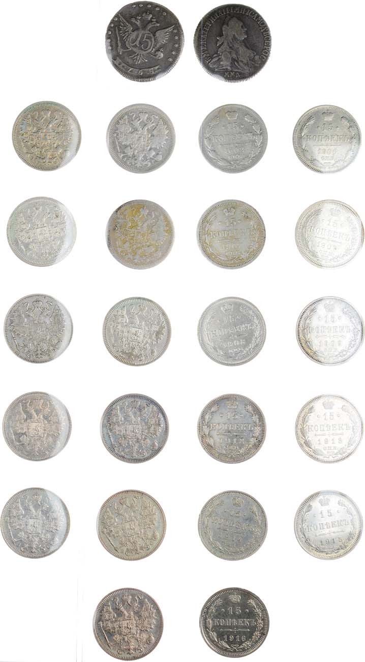 Серебро. 15 копеек 1765 года. Екатерина II. ММД. 3,53 г. Уздеников 0979. Биткин 160. XF-. 15 копеек 1902 года. СПБ-АР. 2,59 г. Уздеников 2134. Биткин 128. F. 15 копеек 1906 года. СПБ-ЭБ. 2,57 г. Уздеников 2157. Биткин 132. F. 15 копеек 1907 года. СПБ-ЭБ. 2,41 г. Уздеников 2163. Биткин 133. VF. 15 копеек 1907 года. СПБ-ЭБ. 2,63 г. Уздеников 2163. Биткин 133. AU. 15 копеек 1908 года. СПБ-ЭБ. 2,44 г. Уздеников 2168. Биткин 134. AU. 15 копеек 1909 года. СПБ-ЭБ. 2,65 г. Уздеников 2174. Биткин 135. AU. 15 копеек 1912 года. СПБ-ЭБ. 2,61 г. Уздеников 2192. Биткин 137. AU. 15 копеек 1913 года. СПБ-ЭБ. 2,59 г. Уздеников 2202. Биткин 139(R1). AU. 15 копеек 1914 года. СПБ-ВС. 2,62 г. Уздеников 2211. Биткин 141. UNC. 15 копеек 1915 года. ВС. Петроградский монетный двор. 2,63 г. Уздеников 2216. Биткин 142. UNC. 15 копеек 1916 года. ВС. Петроградский монетный двор. 2,75 г. Уздеников 2220. Биткин 143. UNC.