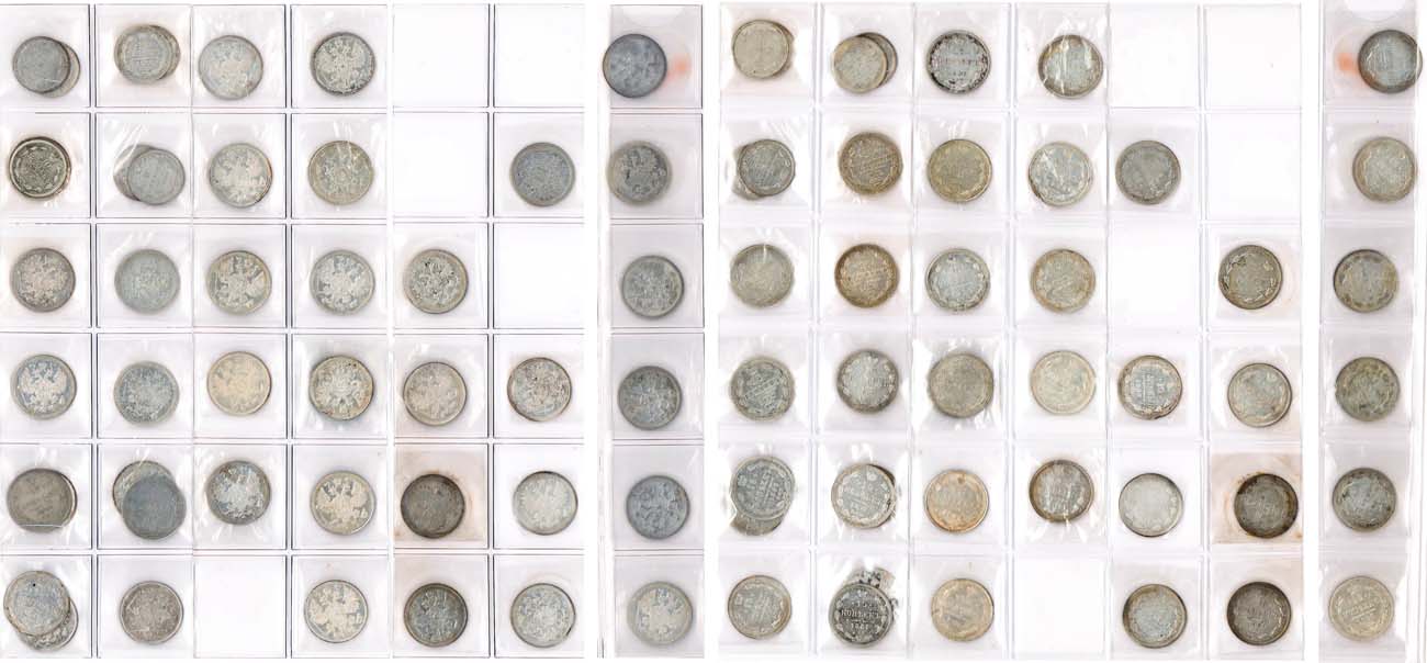 Серебро. 10 копеек 1866 года, 1870, 1874, 1876, 1877, 1878, 1879 гг. 15 копеек 1860 года, 1861, 1862, 1864, 1865, 1869, 1870, 1871, 1874, 1878, 1880, 1881, 1884, 1889, 1890, 1891, 1897, 1898,1899, 1900, 1901 (2 шт.), 1902, 1903, 1904, 1905, 1906, 1907 ,1908, 1909, 1911, 1912, 1913 (2 шт.), 1914, 1915, 1916 (2 шт.) VF/AU.