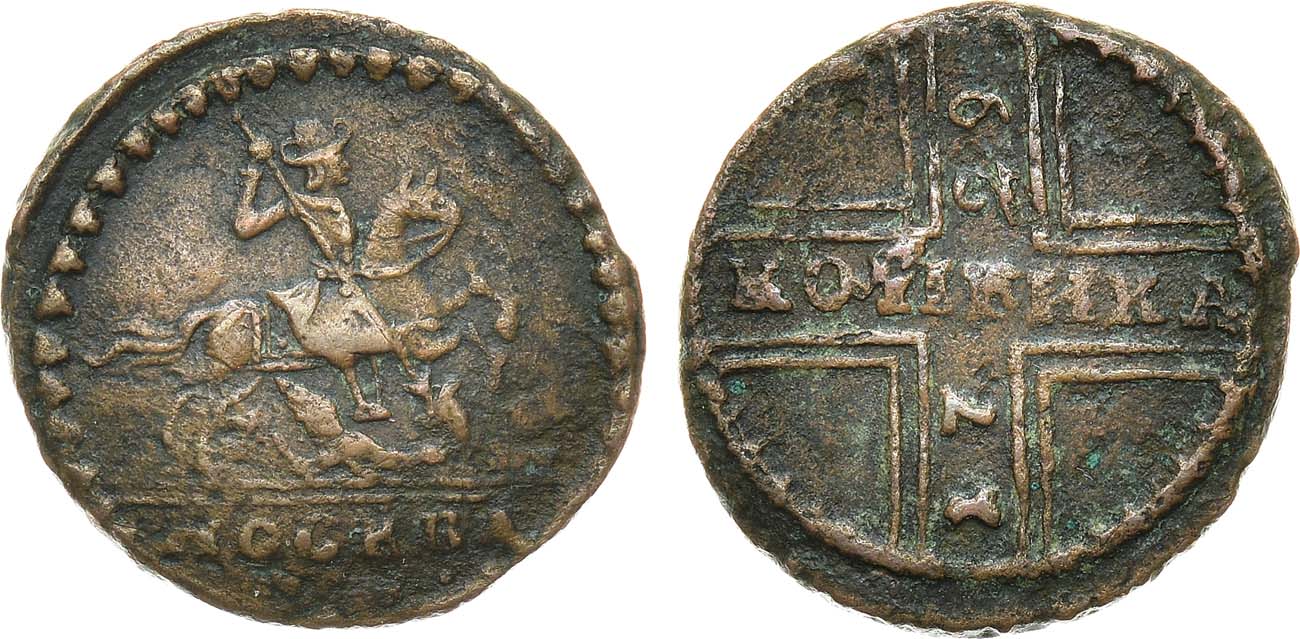 Медь. 3,45г. Кадашевский монетный двор. На аверсе: "МОСКВА" малыми буквами. Уздеников 2476. Биткин 214(R1). Дьяков 129, 2. Brekke 15. VF.