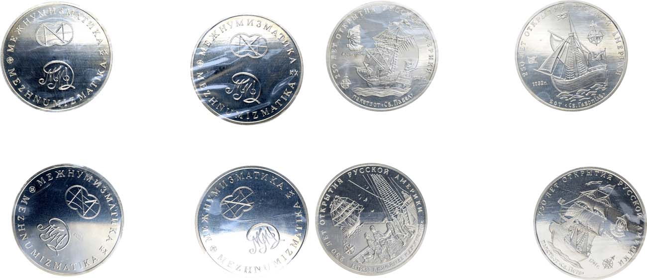 Медно-никелевый сплав. Московский монетный двор. МЕЖНУМИЗМАТИКА (К•Х.). Серия 250 лет открытия Русской Америки: Встреча Измайлова и Кука; Бот "Святой Гавриил"; Пакетбот "Святой Павел"; Пакетбот "Святой Пётр". В запайках монетного двора. PROOF.