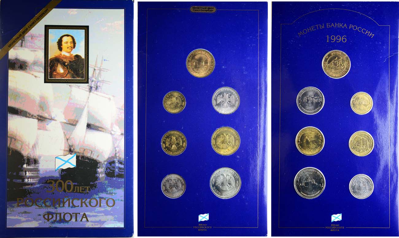 Санкт-Петербургский монетный двор. В набор входят: Жетон СПМД, монеты 1 рубль (Рыболовный траулер), 5 рублей (Рыболовное судно "Товарищ"), 10 рублей (Грузовое судно), 20 рублей (Научно-исследовательское судно), 50 рублей (Подводный крейсер), 100 рублей (Атомный ледокол "Арктика"). BU.