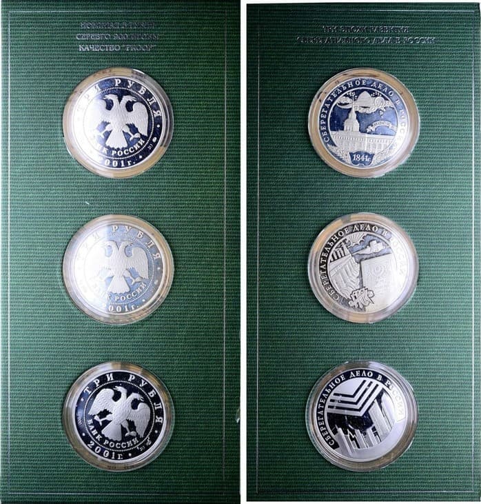 Серебро. 3 Рубля 2001 года. Сберегательное дело в России. Эмблема Сбербанка. Серебро, 34,88 г. Московский монетный двор. КМ 736. 3 Рубля 2001 года. Сберегательное дело в России. Сберкнижка. Серебро, 34,75 г. Московский монетный двор. КМ 735. 3 Рубля 2001 г. Сберегательное дело в России. Москва. Серебро, 34,73 г. Московский монетный двор. КМ 734. PROOF.
