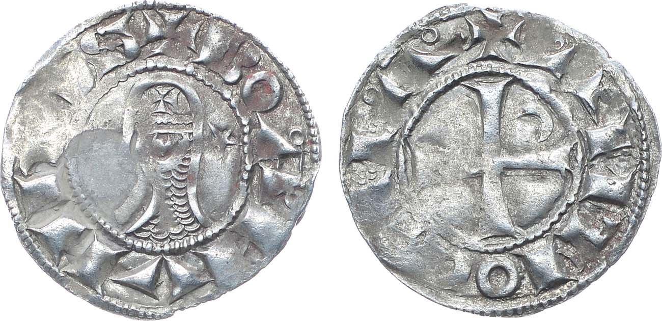Серебро. 0,95г. Антиохия-на-Оронте. Аверс: бюст в шлеме влево между звездой и полумесяцем; легенда "+ BOANVNDVS". Реверс: крест с полумесяцем; легенда "+ ANTIOCHIA". XF.