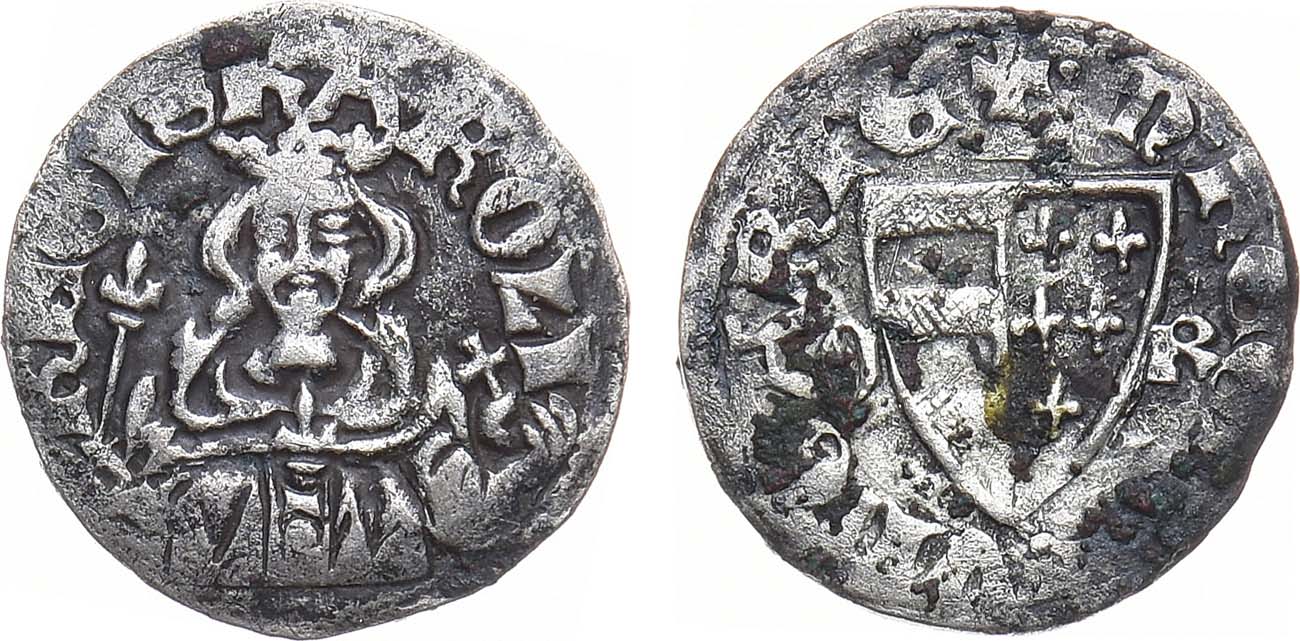 Серебро. 0,65г. Аверс: король, сидящий анфас, со скипетром и державой; легенда "REGIS KAROLI". Реверс: венгерский герб; легенда "+ m REGIS hVnGARIE". VF-.