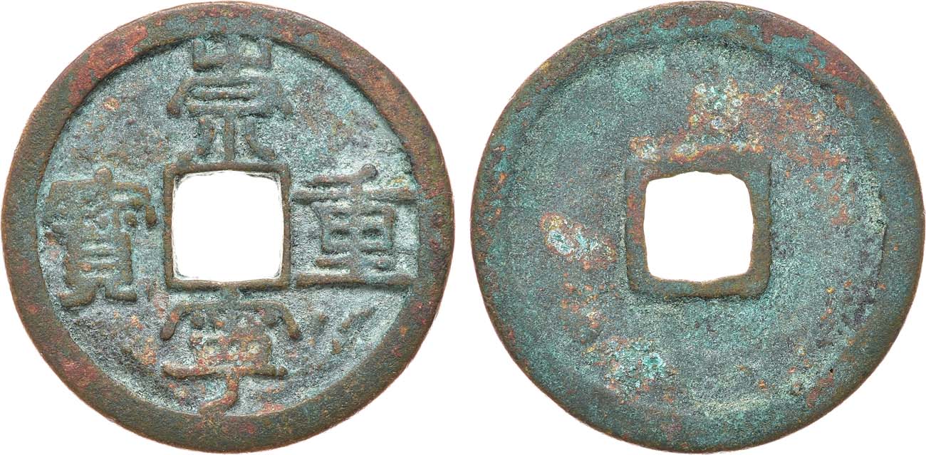 Бронза. 8,06г. Архаичный стиль письма лишу (чтение сверху вниз/справа налево): 崇寧重寶 - Чун Нин чжун бао. Девиз правления: Чун Нин (崇寧) 1102-1106 гг - "(Эпоха) Почитания Спокойствия". VF.