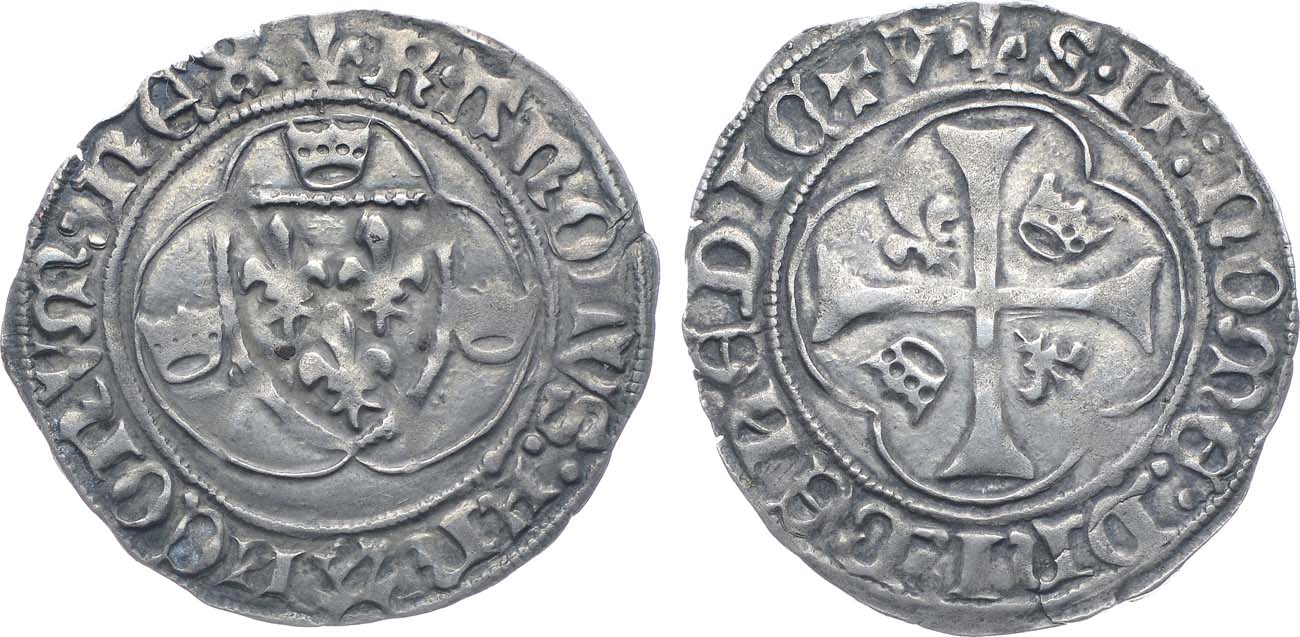 Серебро. 2,33г. Аверс: щит с лилиями и коронами; легенда "+ KAROLVS FRANCORVM REX". Реверс: крест внутри четырехлистника, окружённый лилиями и коронами; легенда "+ SIT NOME DNI BENEDICTV". VF/XF.