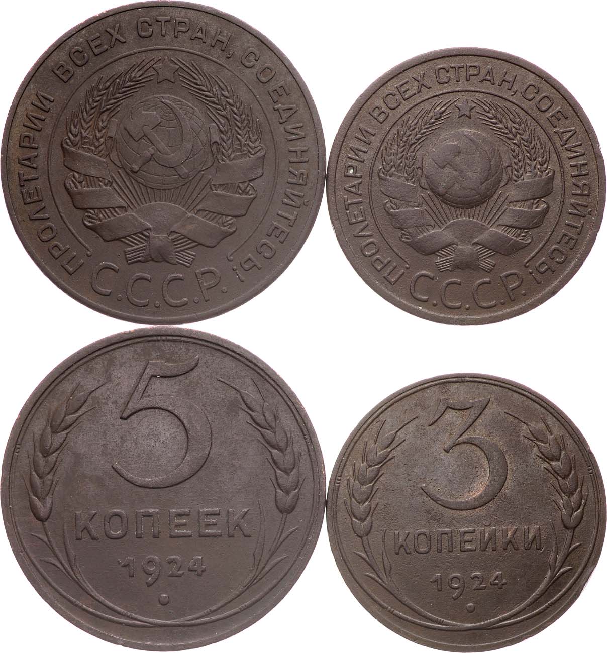 Медь. 5 копеек 1924 года. Гурт гладкий. 16,23 г. Федорин 5 (100 у.е.). AU-. 3 копейки 1924 года. Гурт гладкий. 9,8 г. Федорин 5 (20 у.е.). AU-.