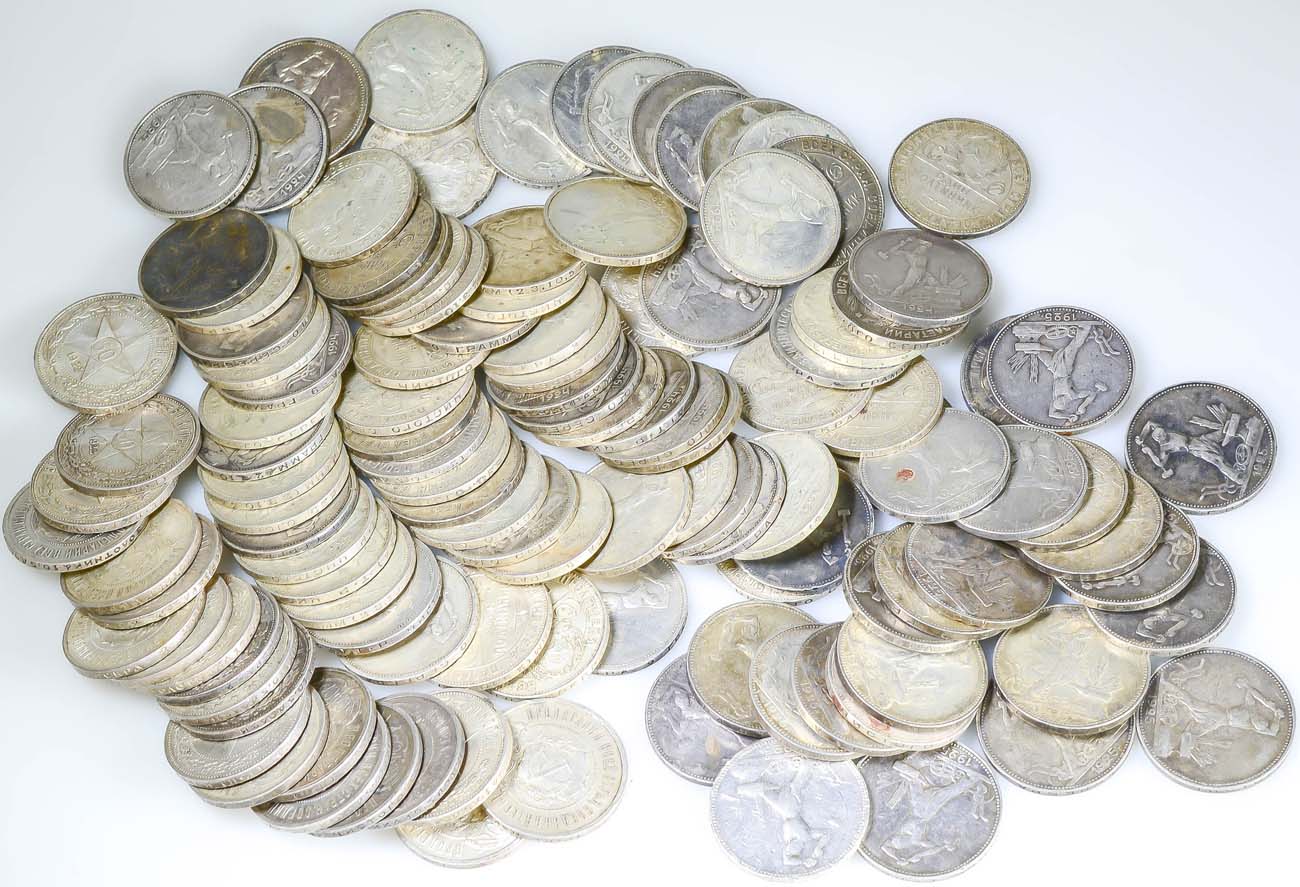 Серебро. 50 копеек 1921 года. (АГ). Федорин 1 (6 у.е.) 7 шт. 50 копеек 1922 года. (АГ) Федорин 2 (15 у.е.) 2 шт. (ПЛ) Федорин 3 (6 у.е.) 21 шт. Полтинник 1924 года Федорин 4 (ТР) 75 шт. Федорин 10 (ПЛ) 59 шт. Полтинник 1925 года Федорин 19 (23 шт.), Федорин 21 (6 шт.). Полтинник 1926 года Федорин 22а (7 шт.), Федорин 22б (4 шт.). Полтинник 1927 года Федорин 23 (3 шт.). VF/UNC.