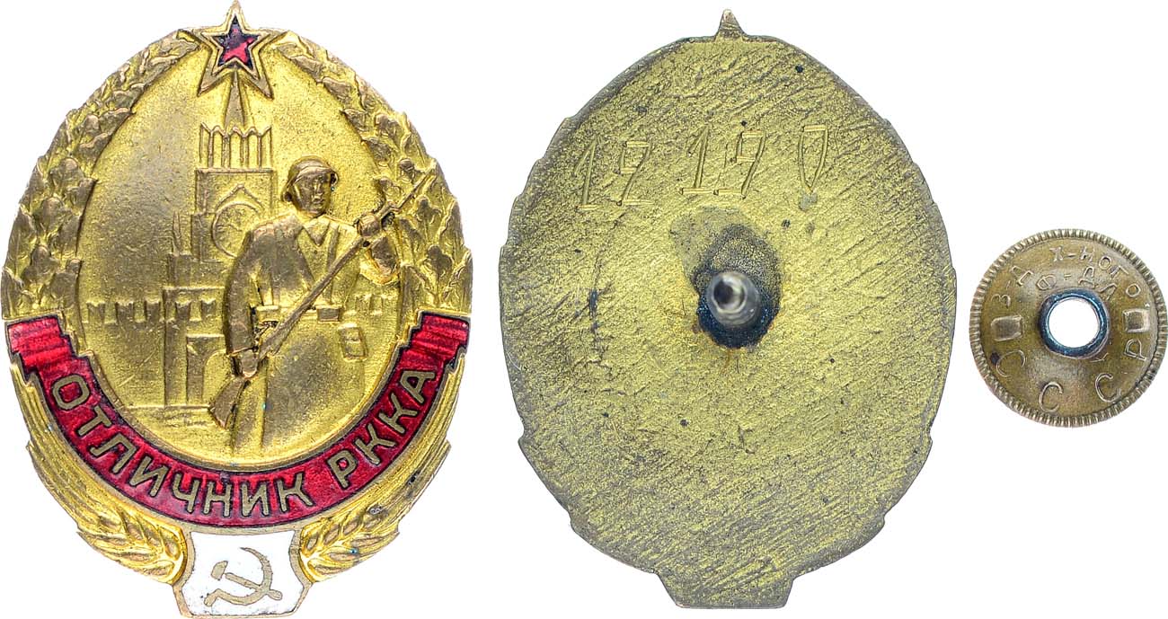 Латунь, золочение, эмаль. 13,51г. Размеры 28х37 мм. Завод художественного фонда СССР, 1939-1940-е гг. На гайке надпись "З-Д Х-НОГО Ф-ДА СССР". На реверсе выгравирован номер "12190". UNC.