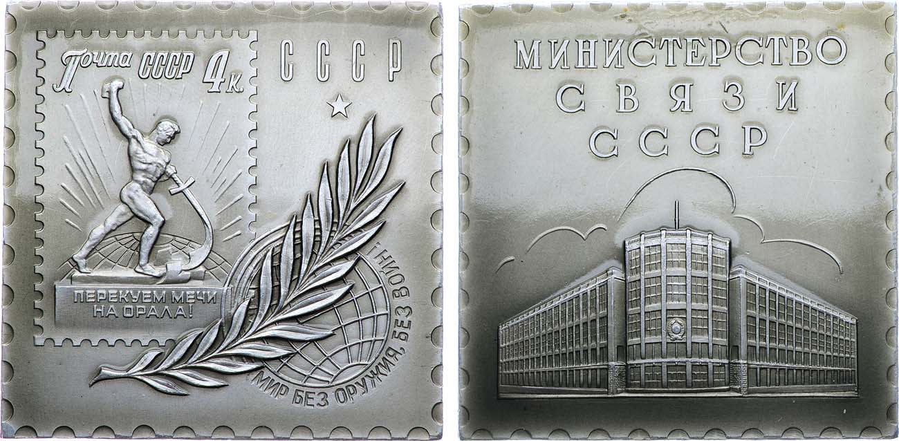 Алюминий, лак. 18,91г. Размеры: 48х48 см. Ленинградский монетный двор. Медальер И.Л. Левин (без подписи медальера). Аверс: на фоне правой части здания телеграфа без деревьев. Шкурко, Салыков 237а. UNC.