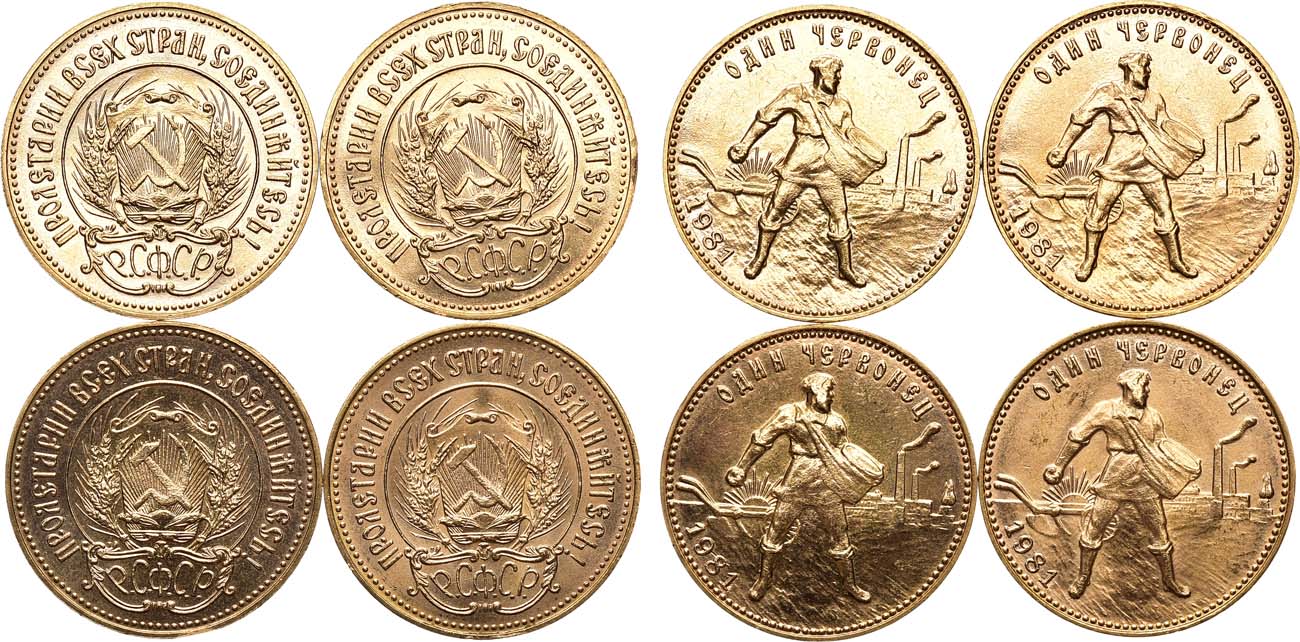 Золото 900 пробы. Червонец 1981 года. Московский монетный двор. 8,53 г. Федорин 12 (400 у.е.). UNC. Червонец 1981 года. Московский монетный двор. 8,62 г. Федорин 12 (400 у.е.). Запил кромки гурта аверса на 4 часа. AU. Червонец 1981 года. Московский монетный двор. 8,54 г. Федорин 12 (400 у.е.). UNC. Червонец 1981 года. Московский монетный двор. 8,64 г. Федорин 12 (400 у.е.). Ударчик по кромке гурта аверсе на 6 часов, запил кромки гурта реверса на 11 часов. UNC-. ФедоринVI 12 (400 у.е.).