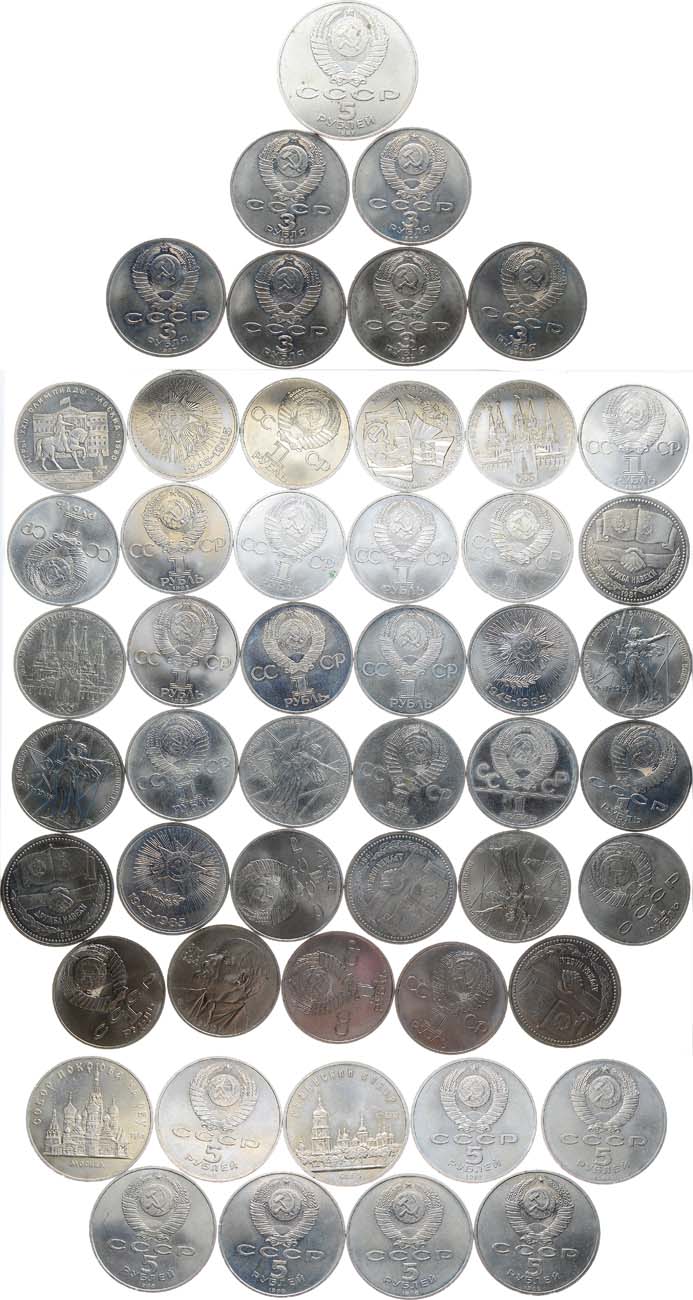 Медно-никелевый сплав. 5 рублей 1987 года. (Большие 5 рублей). 70 лет ВОСР. 5 рублей 1988 года. Софийский собор (3 шт.), Памятник Петру I (3 шт.), Памятник 100-летию России. 5 рублей 1989 года. Собор "Покрова на Рву" (2 шт.). 3 рубля 1987 года. 70 лет ВОСР (6 шт.). 1 рубль 1975 года. 30 лет победы в ВОВ (5 шт.). 1 рубль 1977 года. 60 лет ВОСР. 1 рубль 1978 года. Олимпиада-80 (Московский Кремль) (2 шт.). 1 рубль 1980 года. Олимпиада-80 (Памятник Юрию Долгорукому, Моссовет) (3 шт.). 1 рубль 1981 года. СССР-Болгария (Дружба навеки) (10 шт.). 1 рубль 1984 года. Д.И. Менделеев (2 шт.). 1 рубль 1985 года. В.И. Ленин. 1 рубль 1985 года. 40 лет победы в ВОВ (6 шт.). 1 рубль 1987 года. 70 лет ВОСР (2 шт.). 1 рубль 1988 года. Л.Н. Толстой (2 шт.). 1 рубль 1989 года. Т.Г. Шевченко.