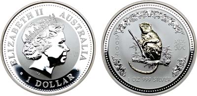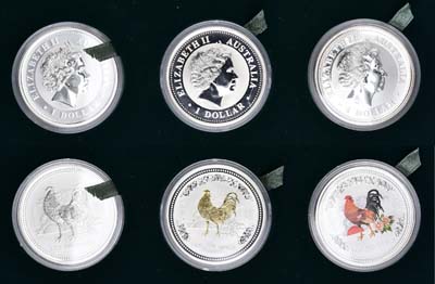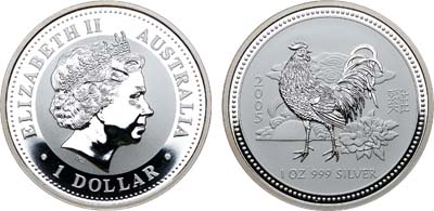 Серебро. Австралия. Британское Содружество. Королева Елизавета II. 1 доллар 2005 года. Серия "Лунный календарь". Год Петуха. Перт. 31,13 г. Проба 999. KM 695. BU. Австралия. Британское Содружество. Королева Елизавета II. 1 доллар 2005 года. Серия "Лунный календарь". Год Петуха. Перт. 31,13 г. Проба 999. Золочение петуха. KM 695а. BU. Австралия. Британское Содружество. Королева Елизавета II. 1 доллар 2005 года. Серия "Лунный календарь". Год Петуха. Перт. 31,13 г. Проба 999. Цветная эмаль. KM 695с. BU.