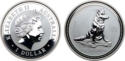 Серебро. Австралия. Британское Содружество. Королева Елизавета II. 1 доллар 2006 года. Серия "Лунный календарь". Год Собаки. Перт. 31,13 г. Проба 999. KM 1882. BU. Австралия. Британское Содружество. Королева Елизавета II. 1 доллар 2006 года. Серия "Лунный календарь". Год Собаки. Перт. 31,85 г. Проба 999. Цветная эмаль. KM UC# 273. BU. Австралия. Британское Содружество. Королева Елизавета II. 1 доллар 2006 года. Серия "Лунный календарь". Год Собаки. Перт. 31,85 г. Проба 999. Золочение собаки. KM UC# 275. BU.