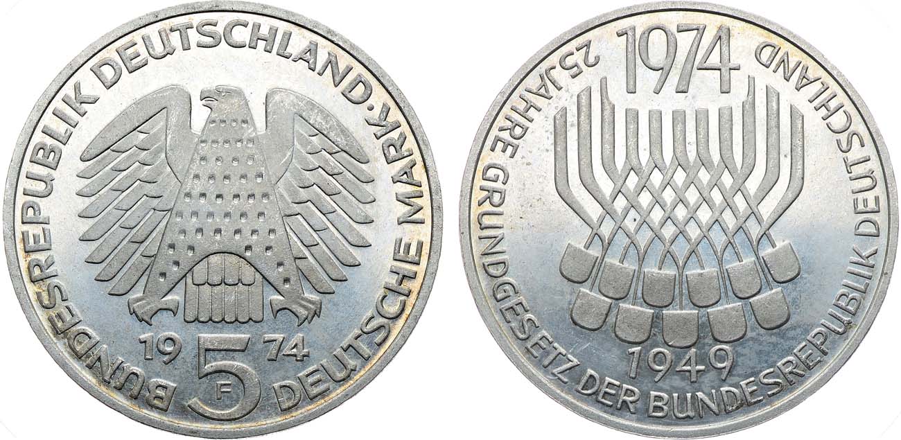 Серебро 625 проба. 11,2г. Штутгарт (F). Тираж 7.750.000 экз. KM 138. UNC.