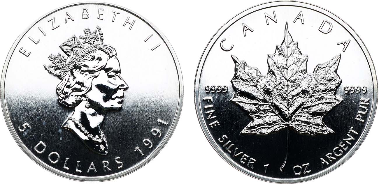Серебро 999 пробы. 31,11г. Оттава. Тираж: 644.300 экз. KM 187. BU.