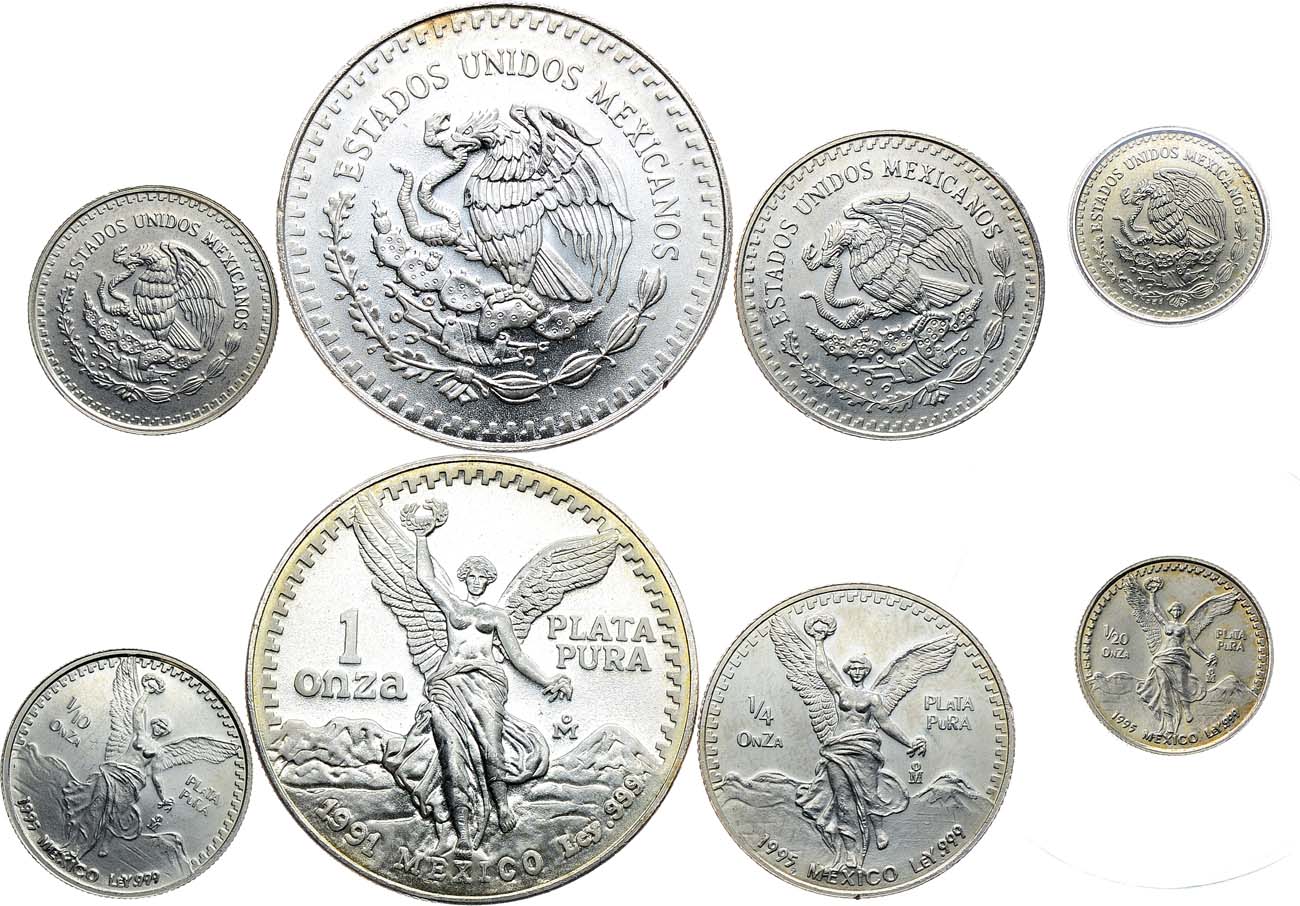 Серебро 999 пробы. 1 унция 1991 года. Серебро 999 пробы. 31,15 г. Мехико (Mo). Тираж: 109.193 экз. KM 592. UNC. 1/4 унции 1995 года. Серебро 999 пробы. 7,71 г. Мехико (Mo). Тираж: 50.000 экз. KM 544. UNC. 1/10 унции 1995 года. Серебро 999 пробы. 3,12 г. Мехико (Mo). Тираж: 50.000 экз. KM 543. UNC. 1/20 унции 1995 года. Серебро 999 пробы. 1,55 г. Мехико (Mo). Тираж: 50.000 экз. KM 542. UNC. UNC.
