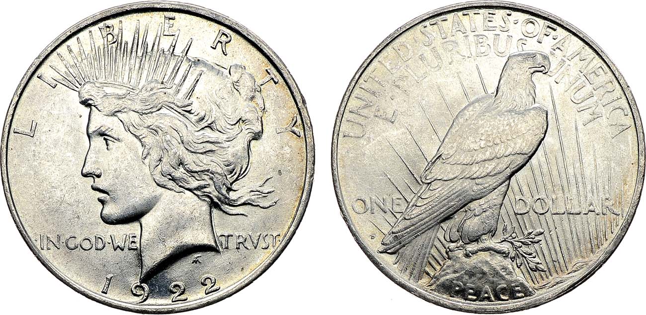 Мирный доллар - серебряная монета США номиналом в 1 доллар. Выпускалась в 1921-1928, 1934-1935 и 1964 годах. Изначально планировалось отчеканить памятную монету в честь окончания Первой мировой войны. Своим названием обязана слову "PEACE" в нижней части реверса.