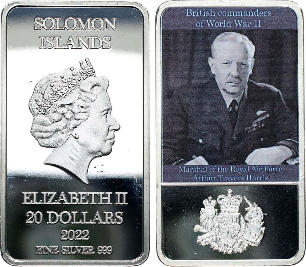Соломоновы острова. Королева Елизавета II. 20 долларов 2022 года. Серия "Британские командиры Второй Мировой войны". Маршал Королевских ВВС-Сэр Артур Траверс Харрис.