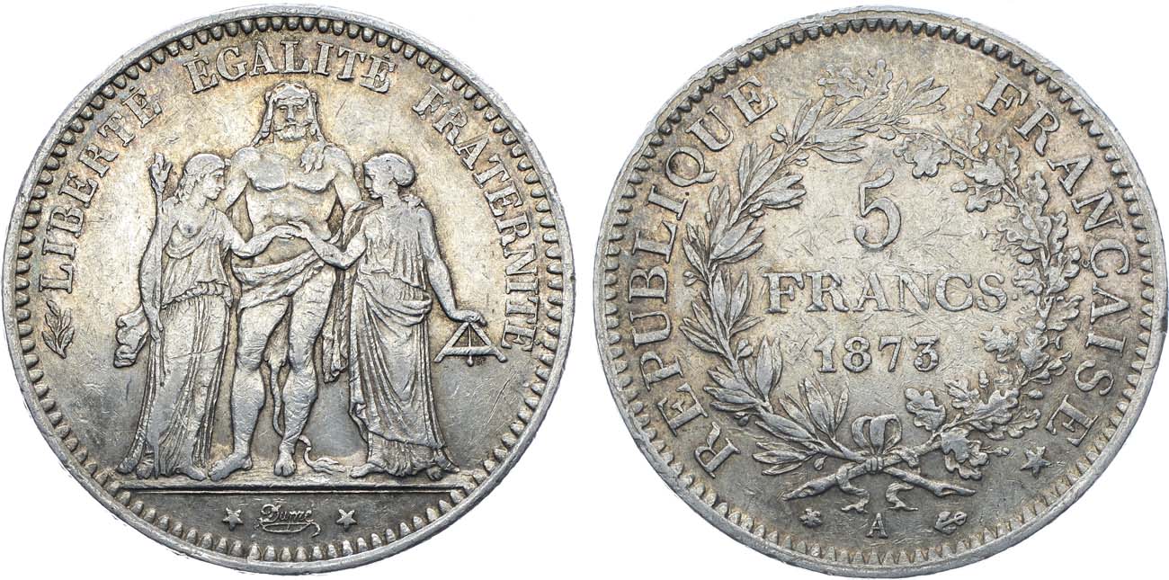 Серебро 900 пробы. 25,04г. Париж (А). KM 820. XF/AU.
