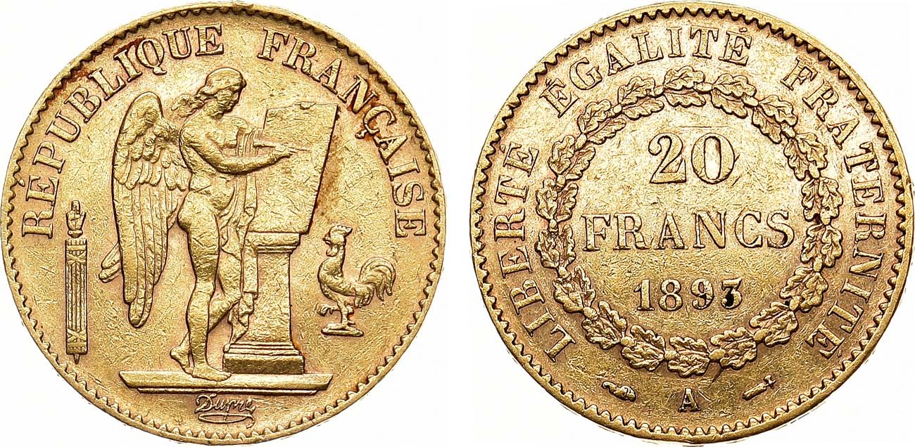 Золото 900 пробы. 6,45г. Париж (A). KM 825. XF.