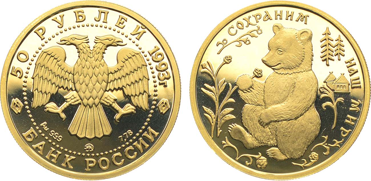 Серия, состоящая из 5 монет из драгоценных металлов, посвящена бурому медведю. Места его обитания - Кавказ, Камчатка, Сибири и Приморский край на Дальнем Востоке. Длина тела достигает 2,5 метров, вес - свыше 300 кг, всеядное животное, численность которого сокращается.