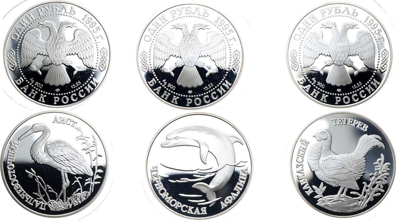 Серебро 900 пробы. 1 рубль 1995 года. Дальневосточный аист. Серебро 900 пробы. 17,44 г. Санкт-Петербургский монетный двор. Тираж: 50.000 экз. ЦБ РФ 5109-0007. PROOF. 1 рубль 1995 года. Кавказский тетерев. Серебро 900 пробы. 17,44 г. Санкт-Петербургский монетный двор. Тираж: 50.000 экз. ЦБ РФ 5109-0008. PROOF. 1 рубль 1995 года. Черноморская афалина. Серебро 900 пробы. 17,44 г. Санкт-Петербургский монетный двор. Тираж: 50.000 экз. ЦБ РФ 5109-0009. PROOF. PROOF.