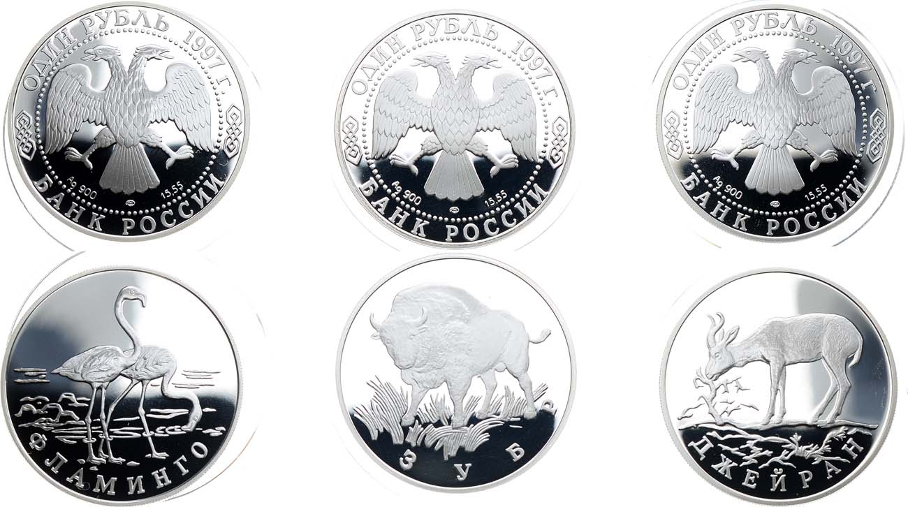 Серебро 900 пробы. 1 рубль 1997 года. Фламинго. Серебро 900 пробы. 17,44 г. Санкт-Петербургский монетный двор. Тираж: 15.000 экз. ЦБ РФ 5109-0027. PROOF. 1 рубль 1997 года. Джейран. Серебро 900 пробы. 17,44 г. Санкт-Петербургский монетный двор. Тираж: 15.000 экз. ЦБ РФ 5109-0028. PROOF. 1 рубль 1997 года. Зубр. Серебро 900 пробы. 17,44 г. Санкт-Петербургский монетный двор. Тираж: 15.000 экз. ЦБ РФ 5109-0029. PROOF. PROOF.