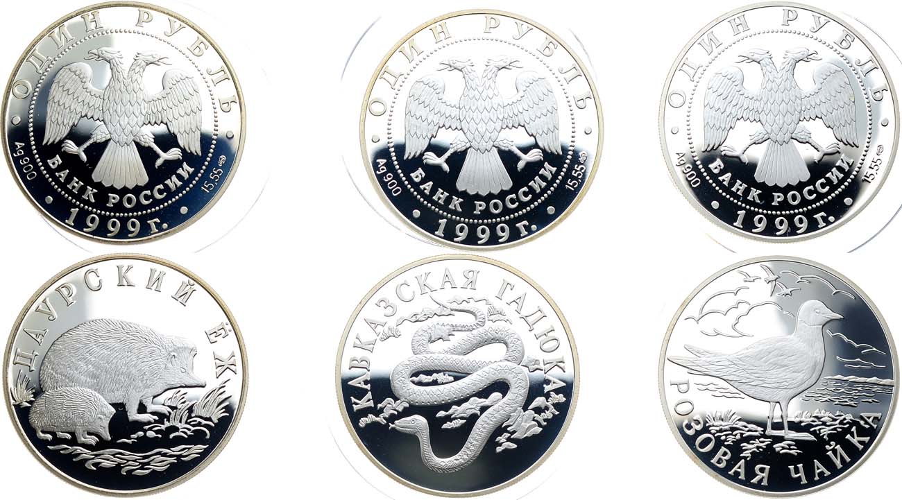 Серебро 900 пробы. 1 рубль 1999 года. Даурский ёж. Серебро 900 пробы. 17,44 г. Санкт-Петербургский монетный двор. Тираж: 15.000 экз. ЦБ РФ 5109-0039. PROOF. 1 рубль 1999 года. Кавказская гадюка. Серебро 900 пробы. 17,44 г. Санкт-Петербургский монетный двор. Тираж: 15.000 экз. ЦБ РФ 5109-0040. PROOF. 1 рубль 1999 года. Розовая чайка. Серебро 900 пробы. 17,44 г. Санкт-Петербургский монетный двор. Тираж: 15.000 экз. ЦБ РФ 5109-0041. PROOF. PROOF.