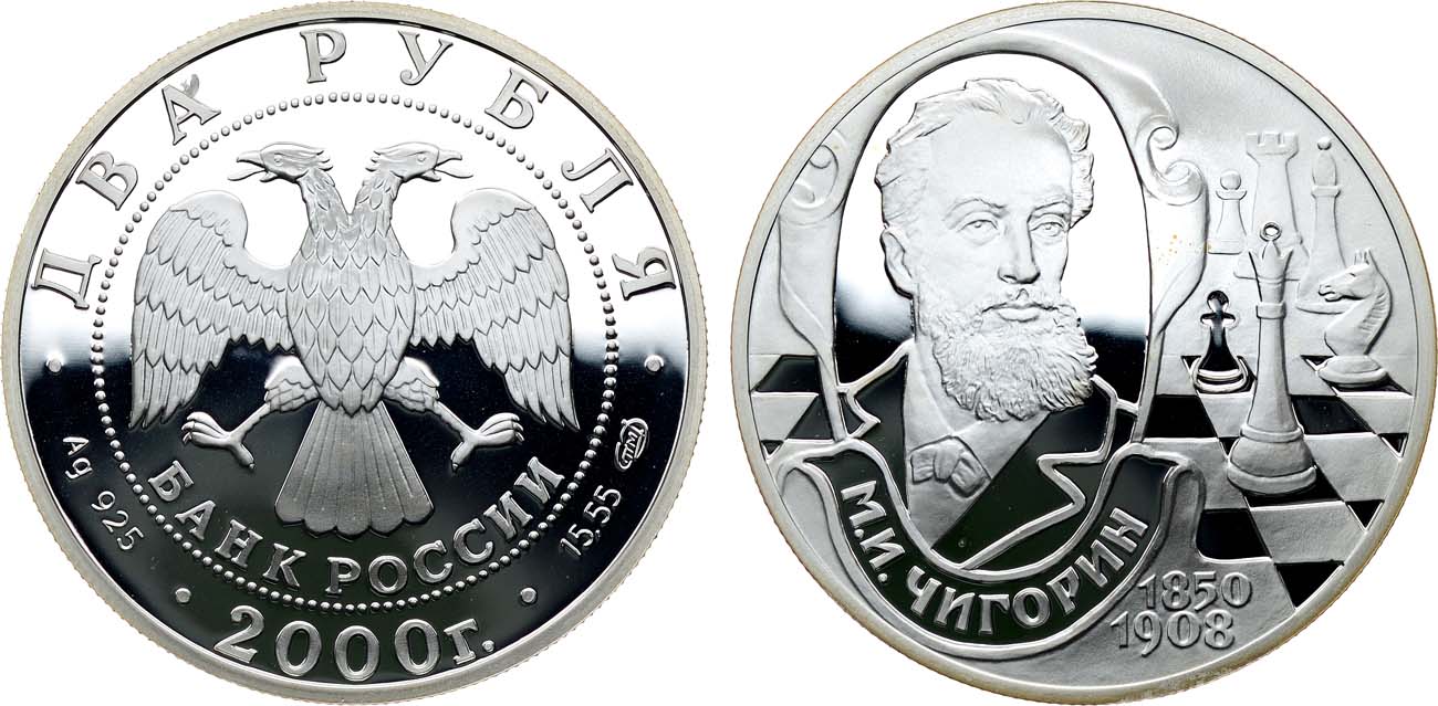 Михаил Иванович Чигорин (1850-1908 гг.) - российский шахматист, один из основоположников русской шахматной школы. Стал первым профессиональным шахматистом Российской империи. В 1889 и 1892 гг. М.И. Чигорин был первым представителем России, участвовавшем в официальном матче за звание чемпиона мира (оба матча против американца В. Стейница). Михаил Иванович также внес весомый вклад в теорию шахмат. В частности, в 1876-1881 гг. им были опубликованы курсы дебютов и концовок игр, придумал несколько вариантов защиты. Монета в оригинальной капсуле.