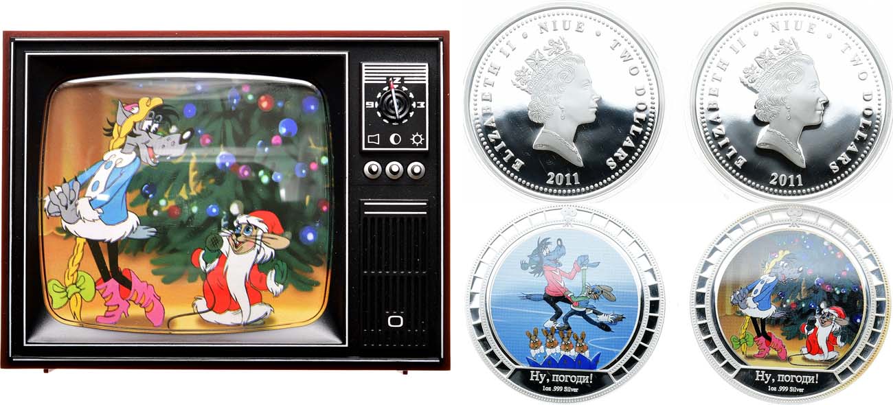 Серебро 999 проба. 31,1г. Ниуэ. 2 доллара 2011 года. Ну погоди! / Дед Мороз и снегурочка. Цветная эмаль. Серебро. 31,1 г. KM 497. PROOF. Ниуэ. 2 доллара 2011 года. Ну погоди! / Катание на коньках. Цветная эмаль. Серебро. 31,1 г. KM 496. PROOF. 497. PROOF.