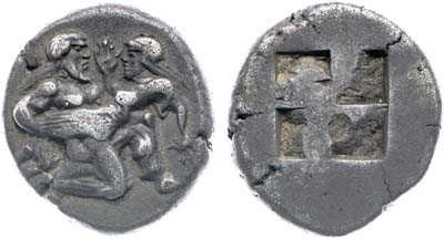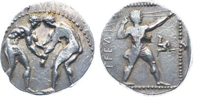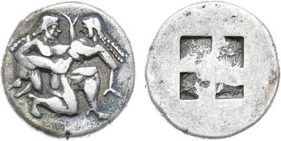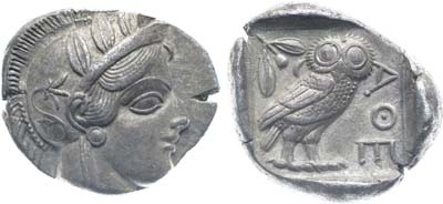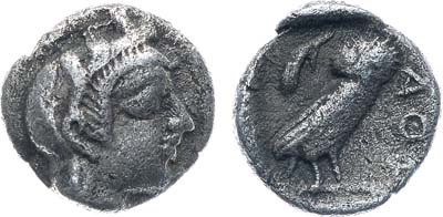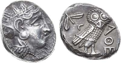 Серебро. 17,12г. Аверс: голова Афины "классического стиля" в аттическом шлеме вправо. Шлем украшен оливковыми листьями, в ухе богини серьга, на шее ожерелье. Реверс: AΘE, сова стоит вправо, голова повернута; оливковая веточка с двумя листьями и одной ягодой, а также полумесяц позади. Copenhagen 31-40. XF/AU.
